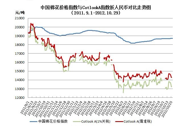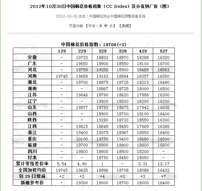 2012年10月30日中国棉花价钱指数(CC Index)及分省到厂价(图)